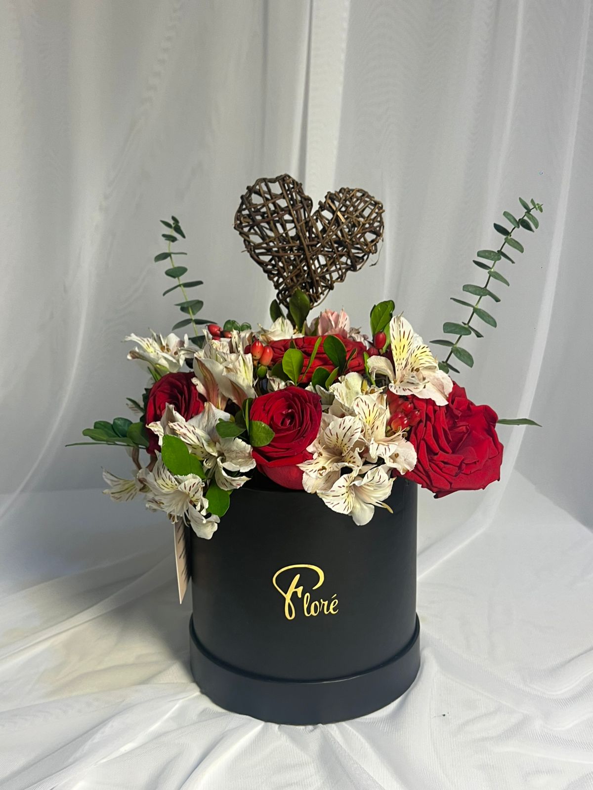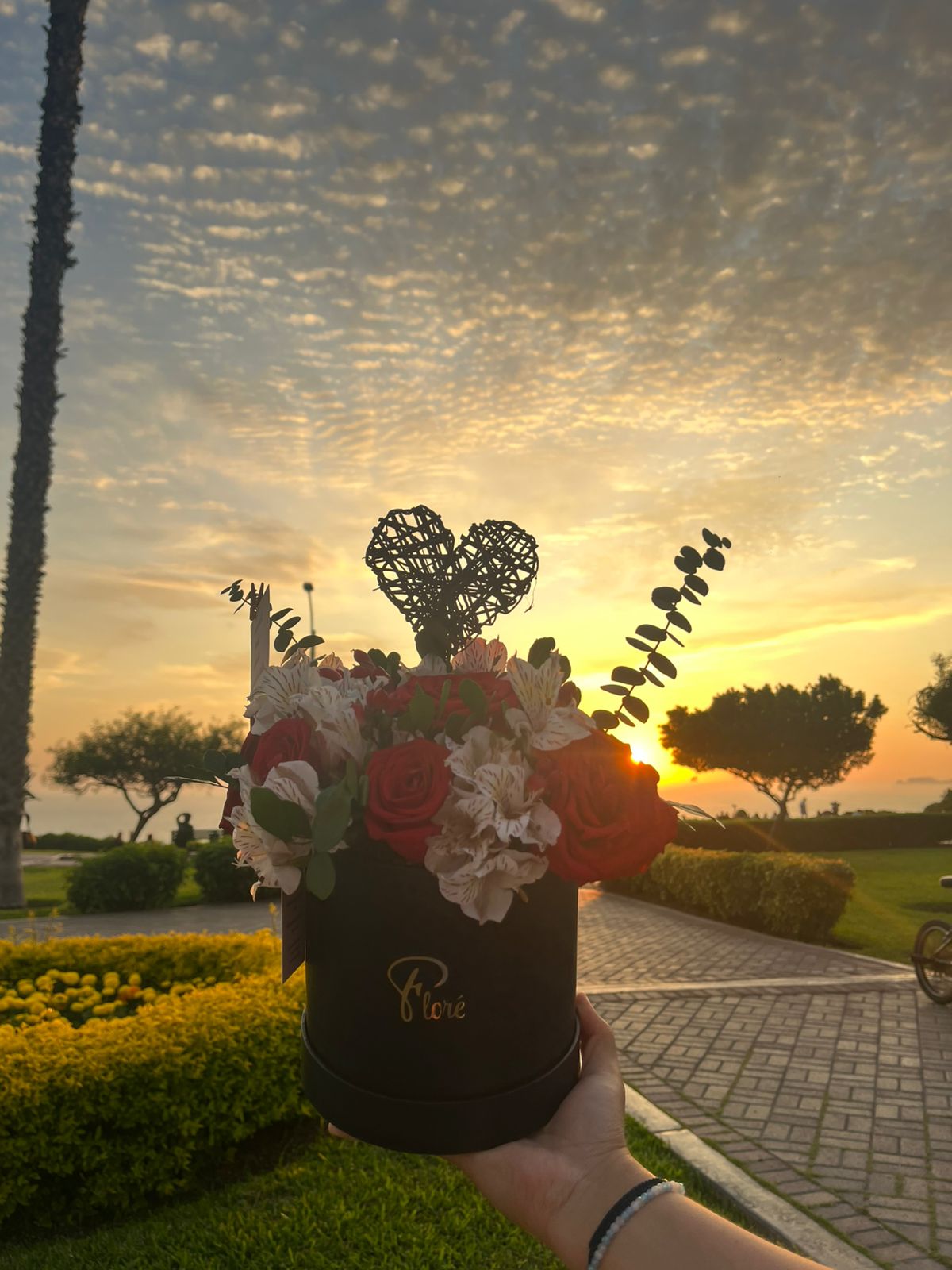 Este hermoso box contiene Rosas rojas, astromelias, follaje y su principal detalle es el corazón de tallos hecho a mano que le da esa originalidad a este bello Box, sin duda alguna en los detalles está la diferencia!