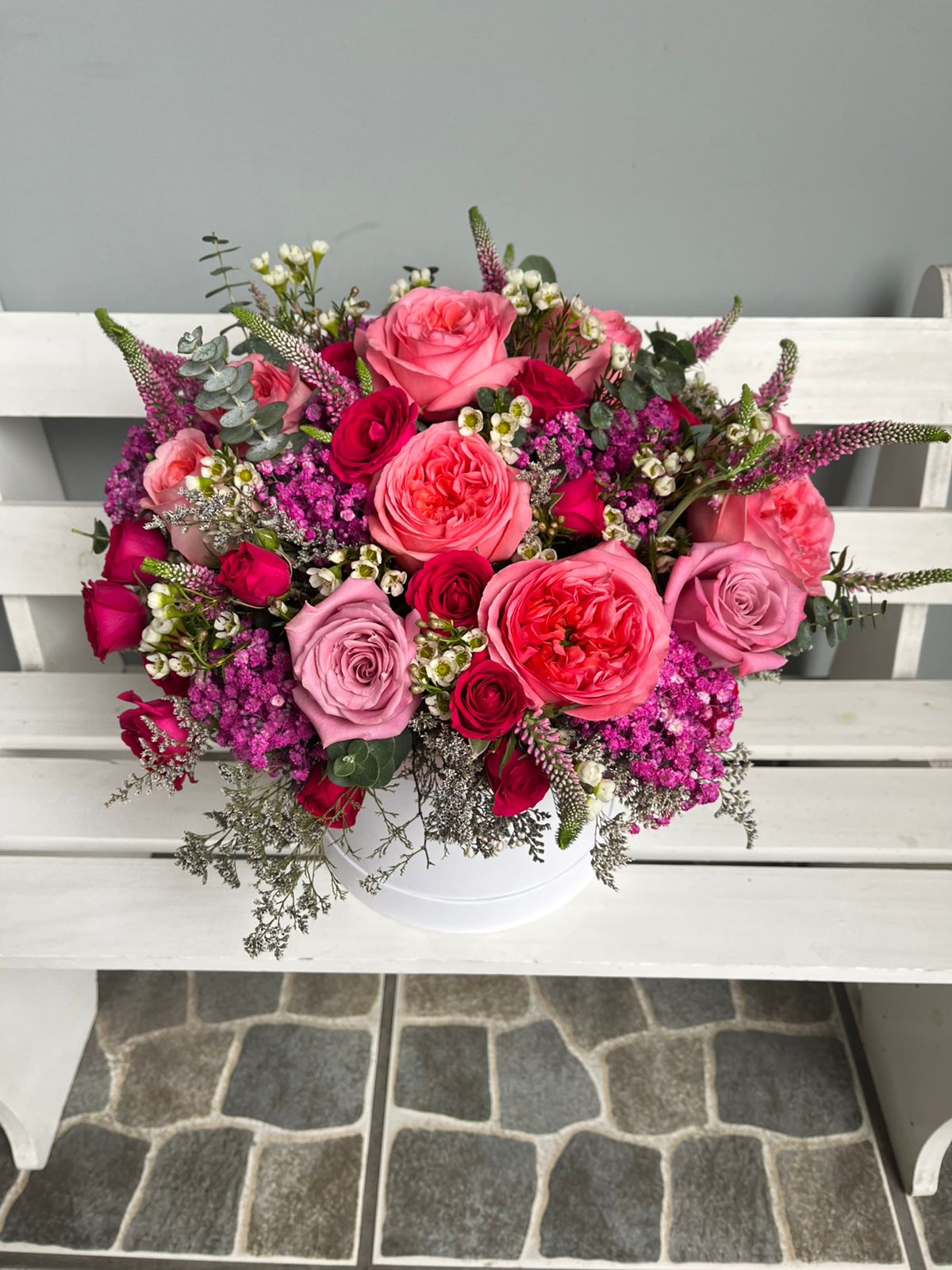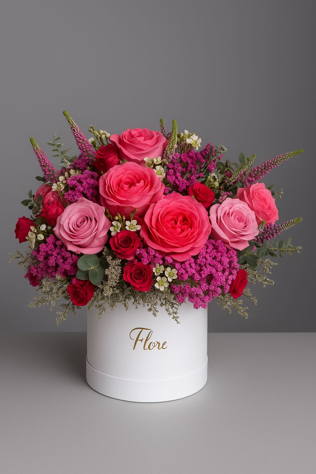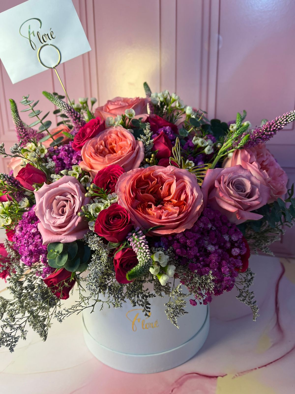 Un regalo de ensueño para celebrar a lo grande. Este elegante box redondo blanco con el sello dorado de Floré está lleno de rosas de jardín, en tonos fucsia, rosa pastel y rosa intenso, combinadas con flores de relleno en morado y blanco que aportan volumen y delicadeza.
