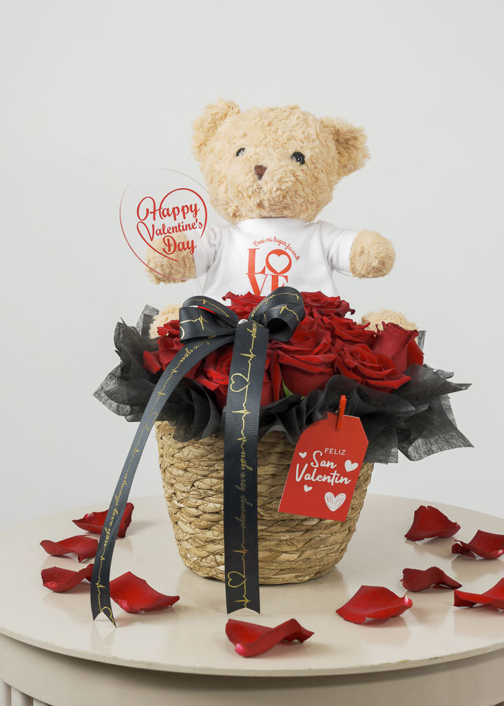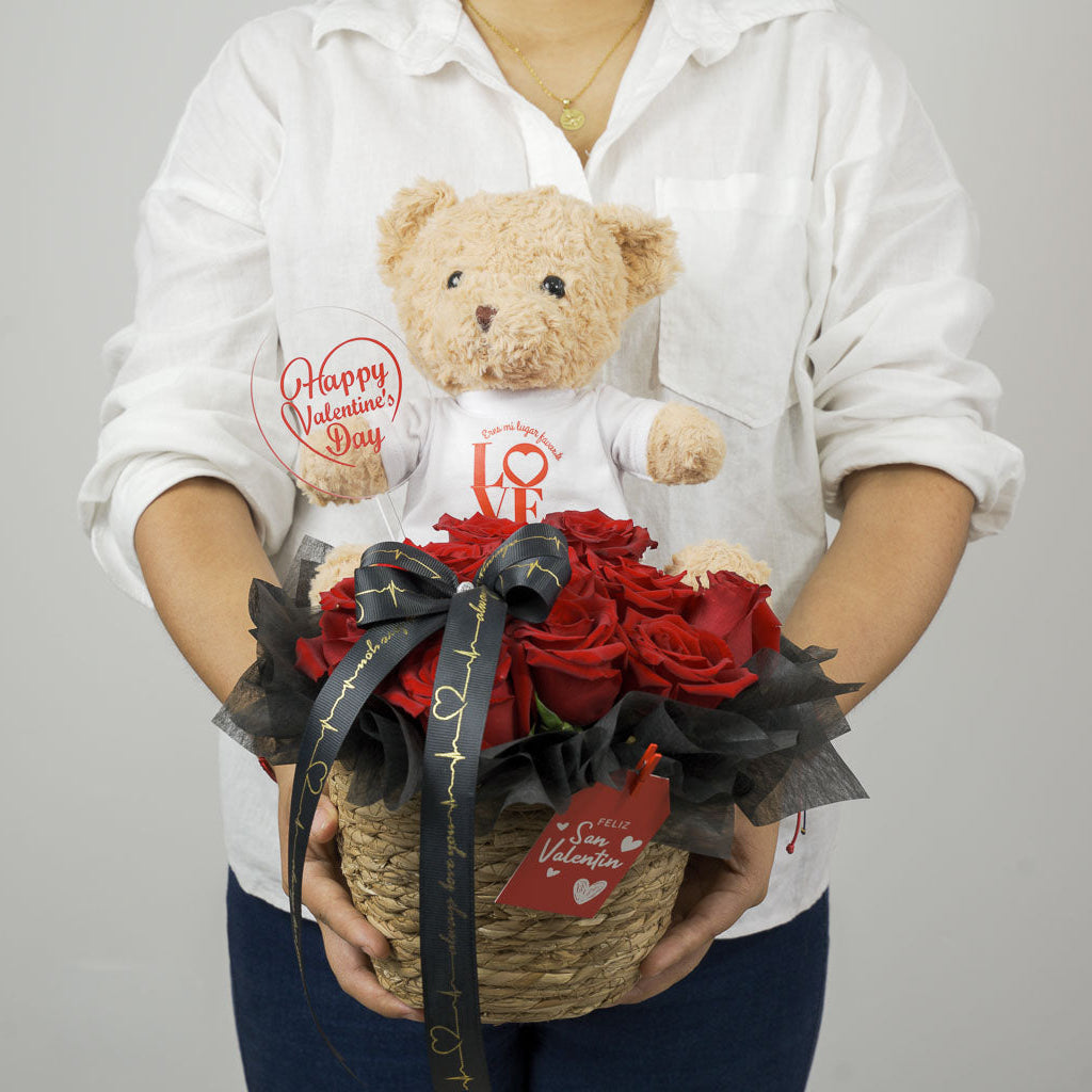 Doce rosas rojas que expresan amor verdadero, acompañadas de Florencio, un osito que abraza cada sentimiento.