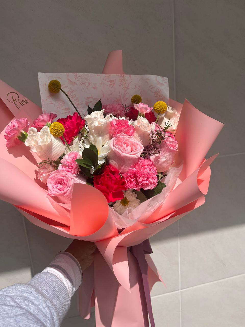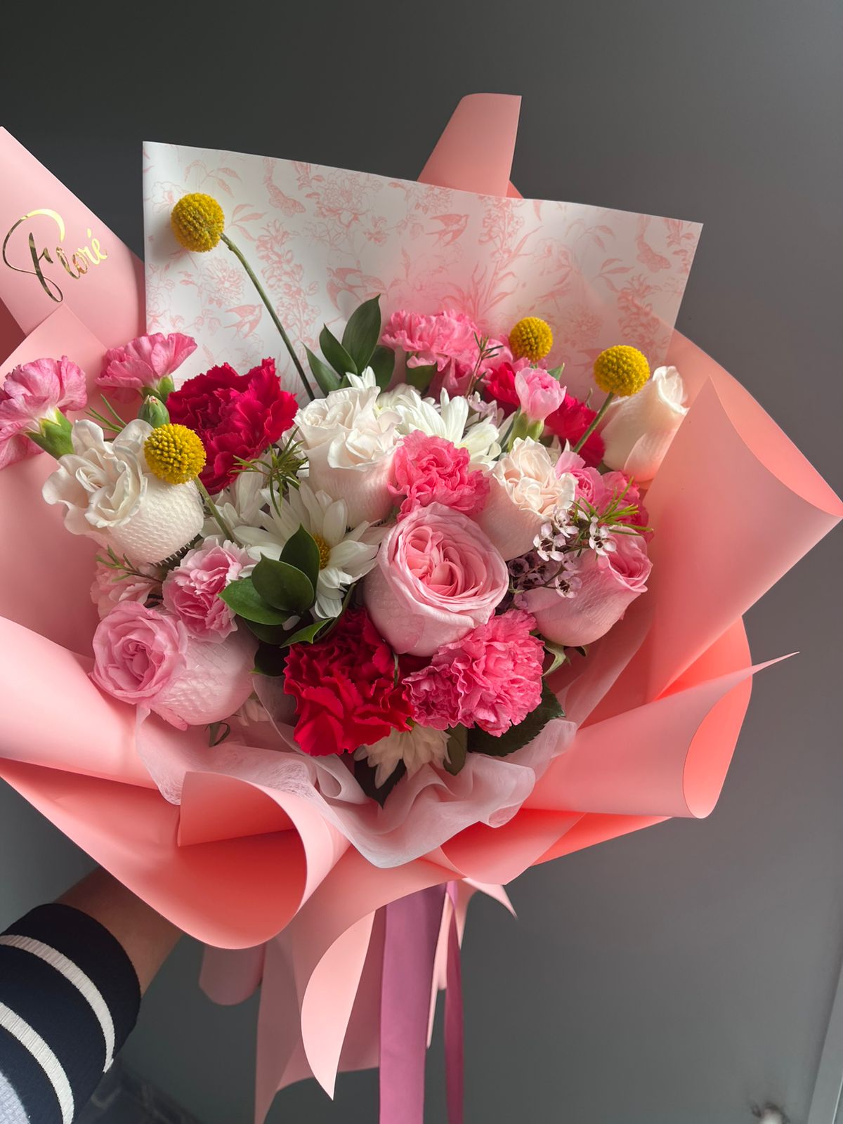 Un exquisito ramo que fusiona la sofisticación de las rosas de jardín en delicados tonos rosados con la intensidad de claveles en fucsia vibrante, el frescor puro de las margaritas blancas y el toque singular de las craspedias doradas. Cada flor ha sido cuidadosamente seleccionada para crear una armonía visual y aromática, envuelta en un elegante papel rosa acompañado de un lazo rosado.